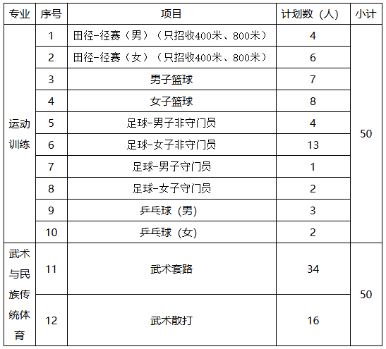 六、招生范围及计划:运动训练、武术与民族传统体育专业招生不列分省计划,面向全国拟招生100人,其中运动训练专业拟招生50人、武术与民族传统体育专业拟招生50人。分项目拟招生计划如下(实际招生计划以国家、省招生部门核定计划为准):